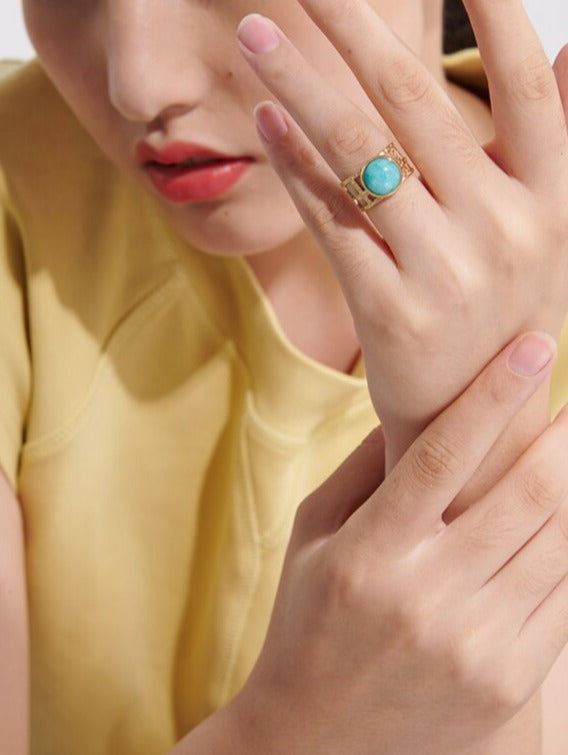 Deixe-se envolver pela serenidade do nosso Anel Banhado a Ouro, acentuado por uma pedra natural azul turquesa. A tonalidade cativante da turquesa adiciona um toque de calma e elegância a esta peça única.