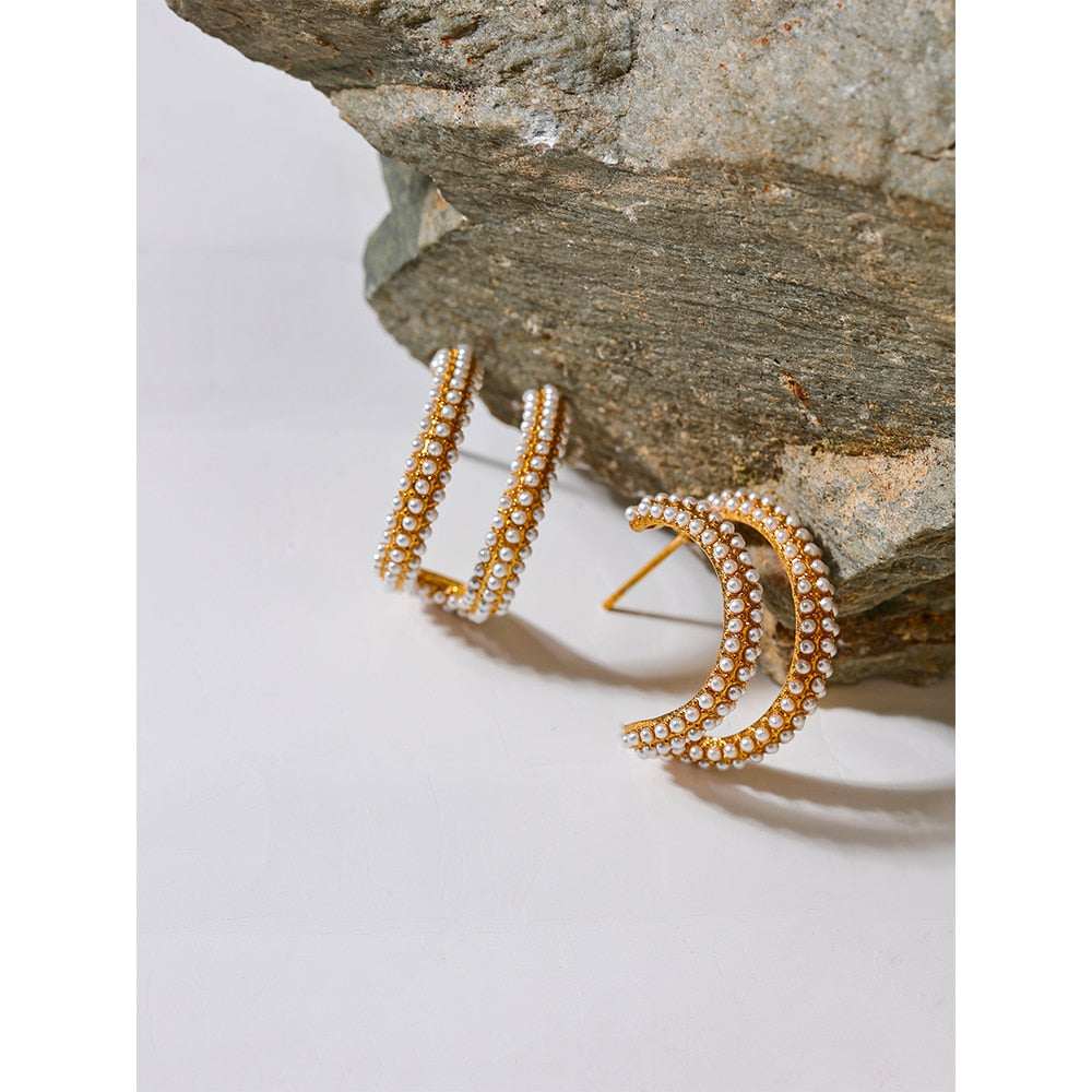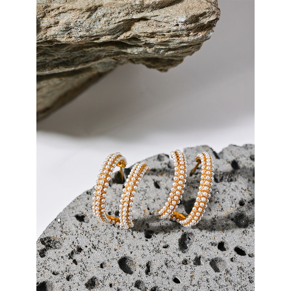 Brinco Argolas Duplas Cravejado de Pérolas e Ouro 18K