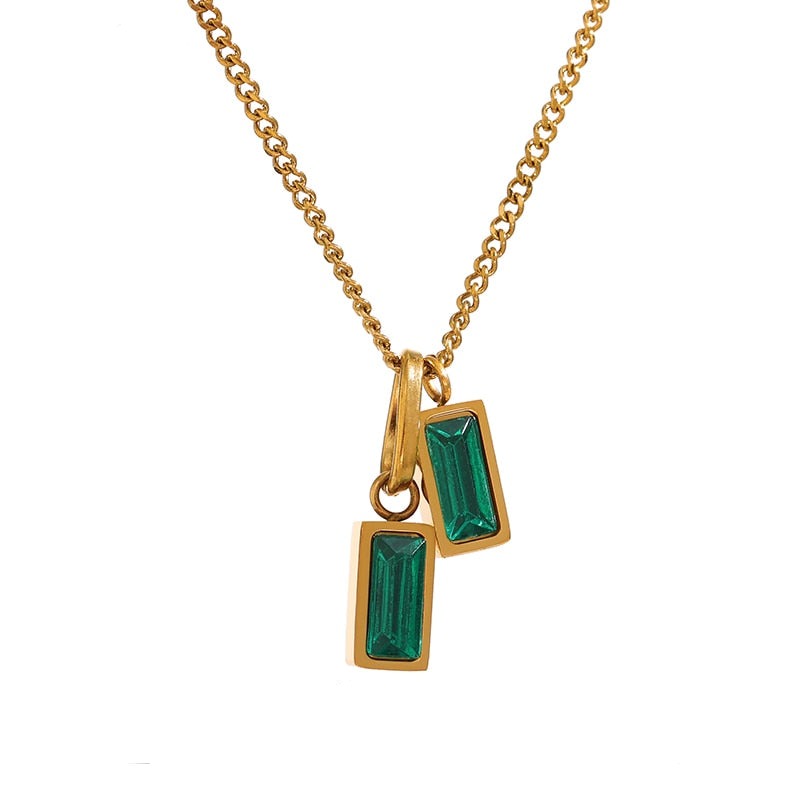 Com dois pingentes deslumbrantes em Zircônia Verde, banhados em Ouro 18K, esta joia é uma declaração de estilo e bom gosto.
