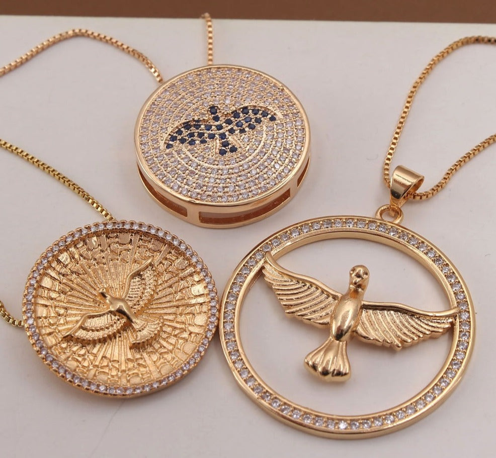 O Colar Espírito Santo de Zircônias está disponível em 4 modelos deslumbrantes, cada um representando o Espírito Santo de maneira única. Cada modelo é cravejado com zircônias brilhantes que adicionam um toque de elegância a essa expressão de fé.