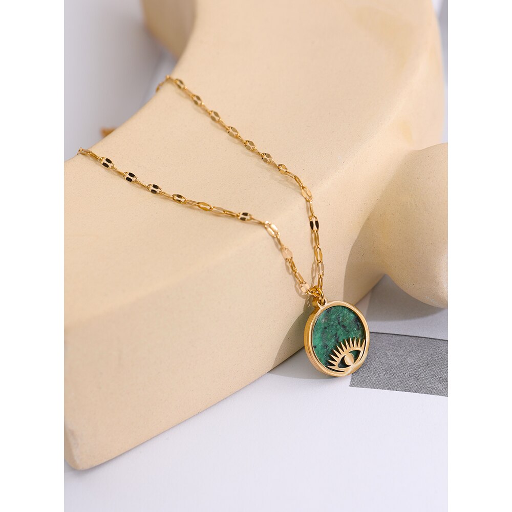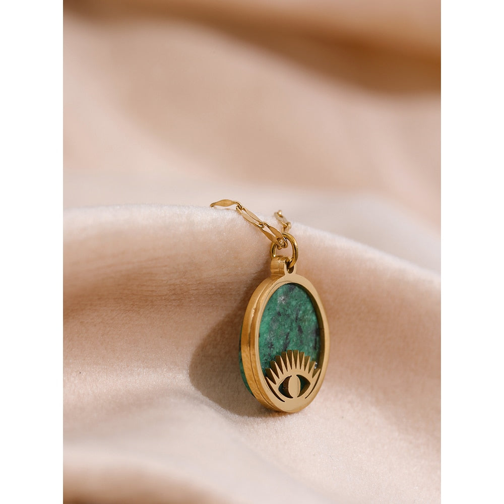 O pingente esculpido em pedra natural verde captura a essência da natureza em sua forma mais pura, com suas tonalidades e texturas únicas. O olho, símbolo de proteção e sabedoria, adiciona um toque de mistério e significado à peça.