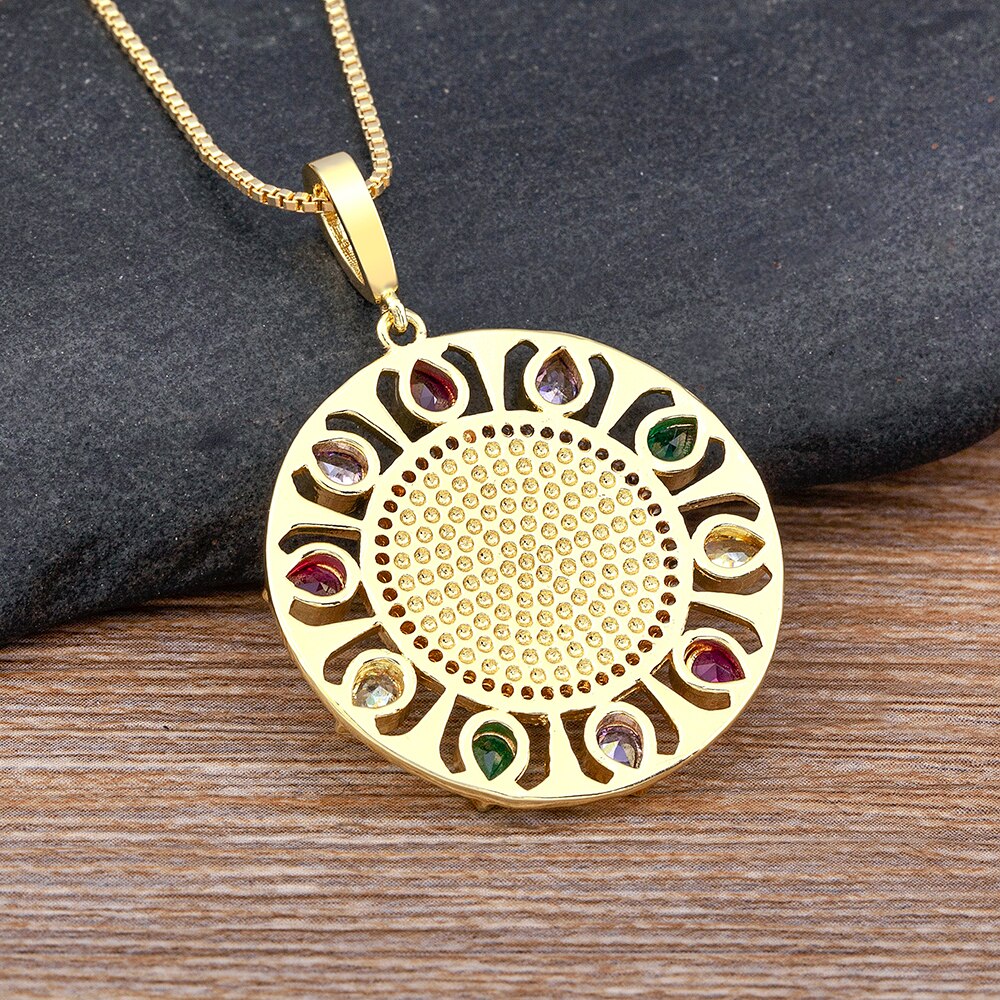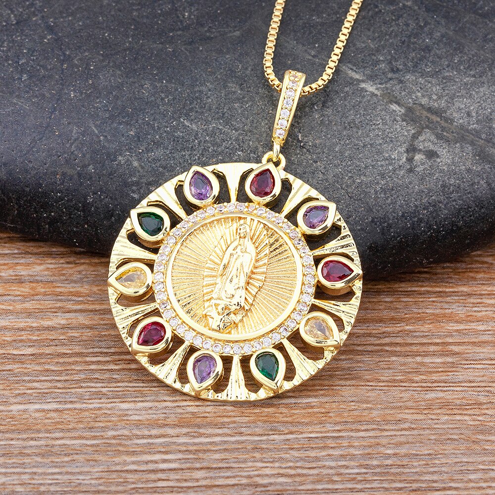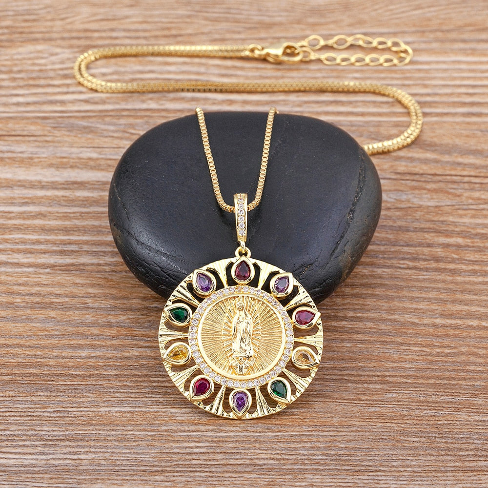- Medalha da Virgem Maria com detalhes de zircônias coloridas.